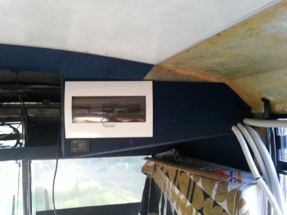 All the 240 v cabling has been run. The external infeed socket has been fitted and wired to the switchboard. The New recessed switchboard has been mounted in the enclosed bin over the drivers position and all circuits connected to it. The main in-feed power runs from the socket to a 16 amp RCD circuit breaker then to the 7000 w inverter-charger and back to a 20 amp RCD circuit breaker in the switchboard.