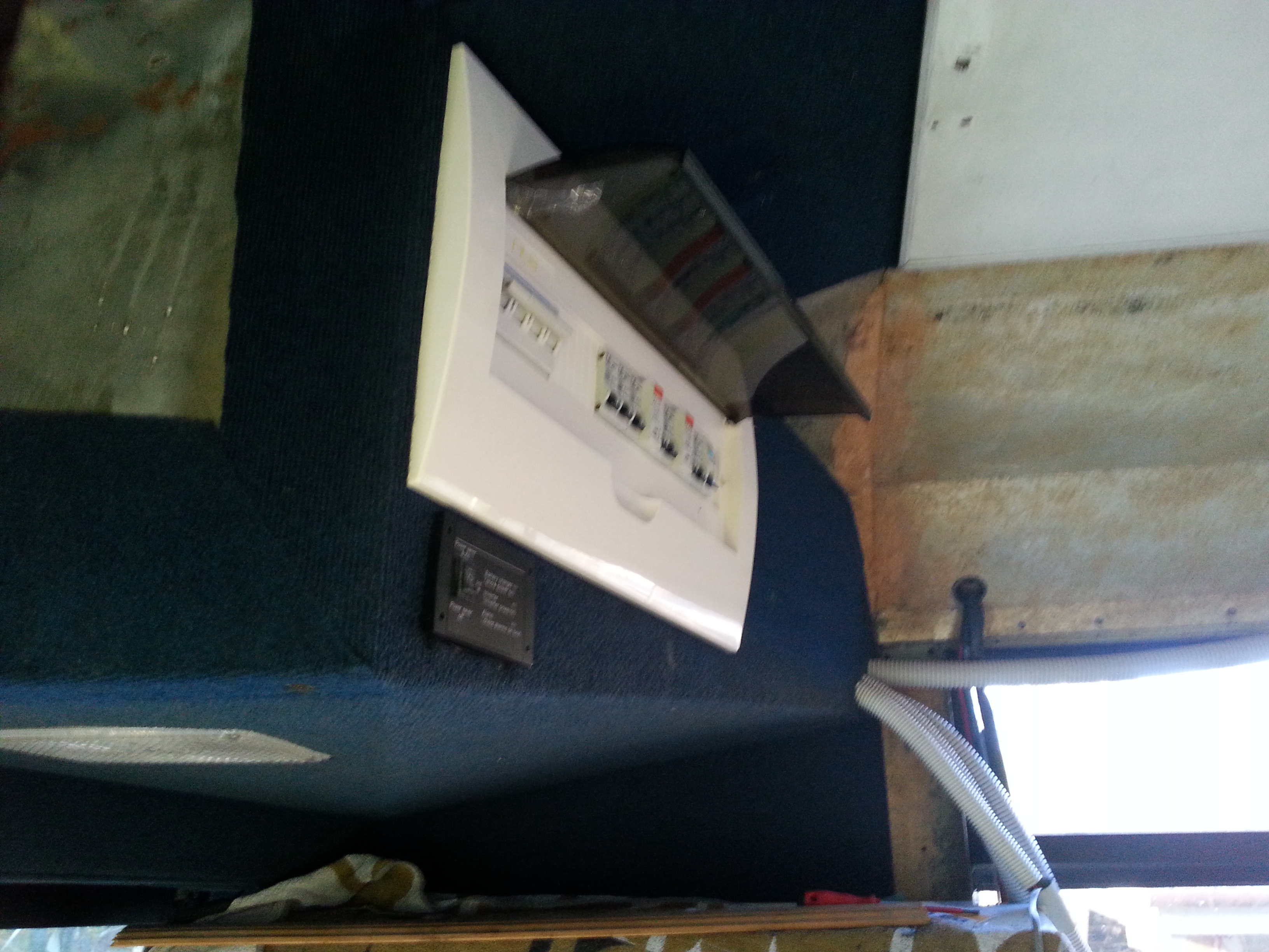 All the 240 v cabling has been run. The external infeed socket has been fitted and wired to the switchboard. The New recessed switchboard has been mounted in the enclosed bin over the drivers position and all circuits connected to it. The main in-feed power runs from the socket to a 16 amp RCD circuit breaker then to the 7000 w inverter-charger and back to a 20 amp RCD circuit breaker in the switchboard.